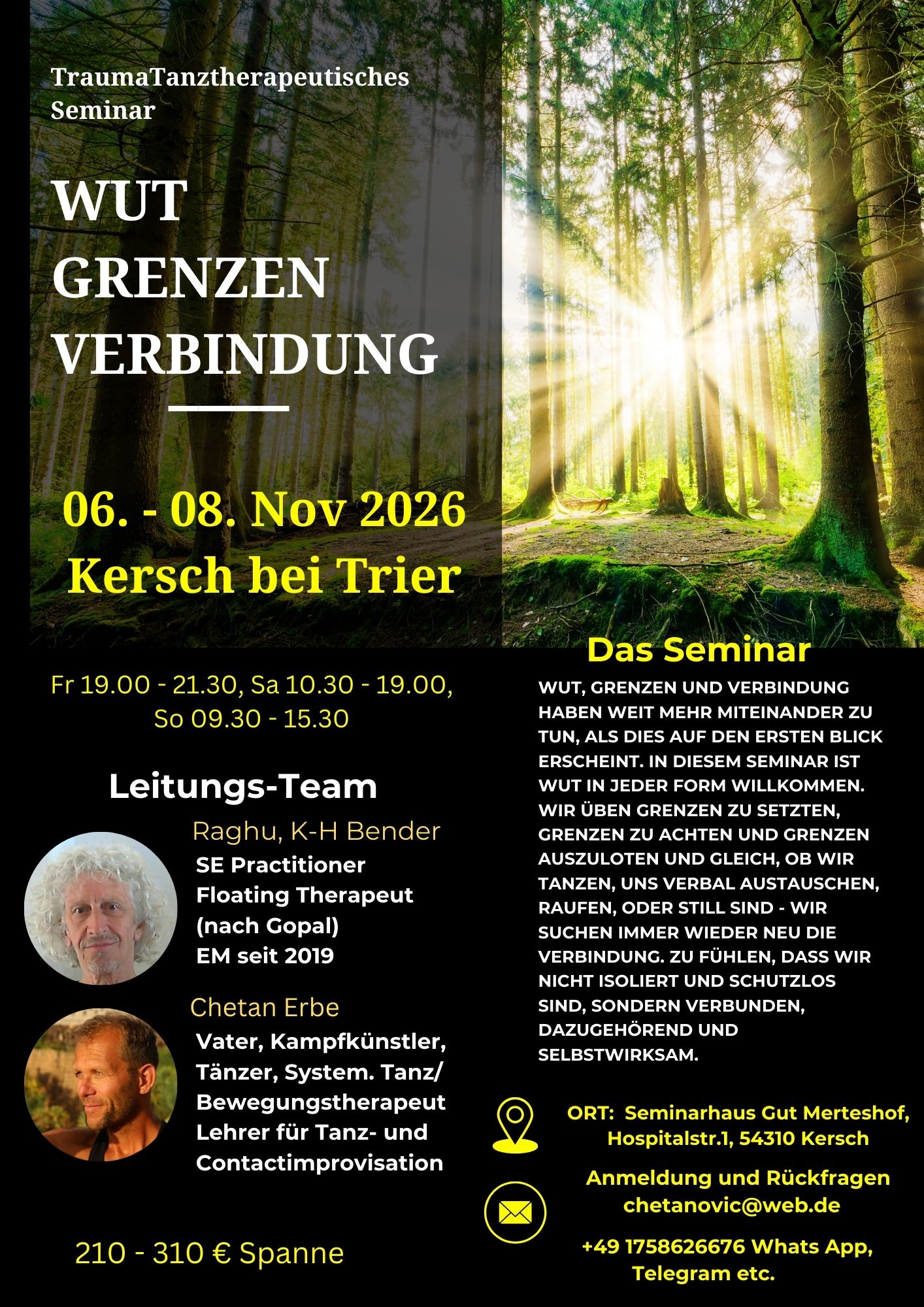 Das arbeiten im Team von 3 erfahrenen LeiterInnen ermöglicht es uns in diesem Seminar intensive Erfahrungsräume für die Gesamtgruppe zu gestalten und parallel/ gleichzeitig innerhalb dieser Räume einzelne TeilnehmerInnen sehr individuell in ihren persönlichen Prozessen zu begleiten. Unser Ziel ist es dabei, dass alle TN von den angebotenen Erfahrungsräumen optimal profitieren.